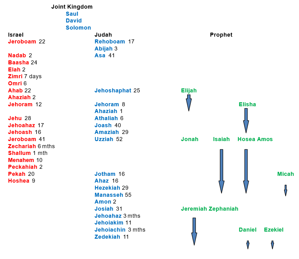 This historical period can be divided into two parts, the joint monarchy of Israel under Saul, David and Solomon, followed by the split monarchy of Israel and Judah until the Assyrian and Babylonian captivities, respectively.